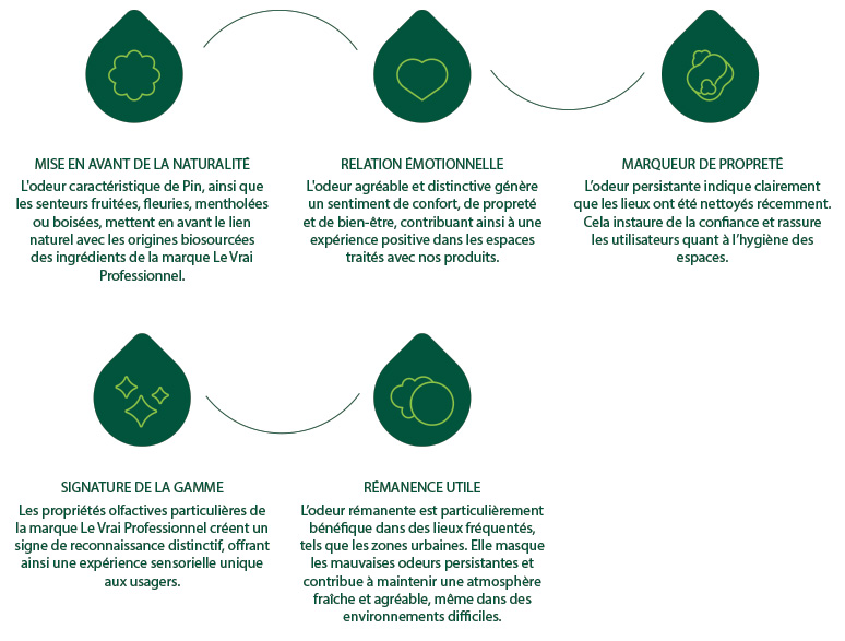 En valorisant ces propriétés olfactives dans la gamme des produits Le Vrai Professionnel, nous offrons aux professionnels du nettoyage des avantages multiples, alliant efficacité, satisfaction des utilisateurs et valorisation de leur travail.